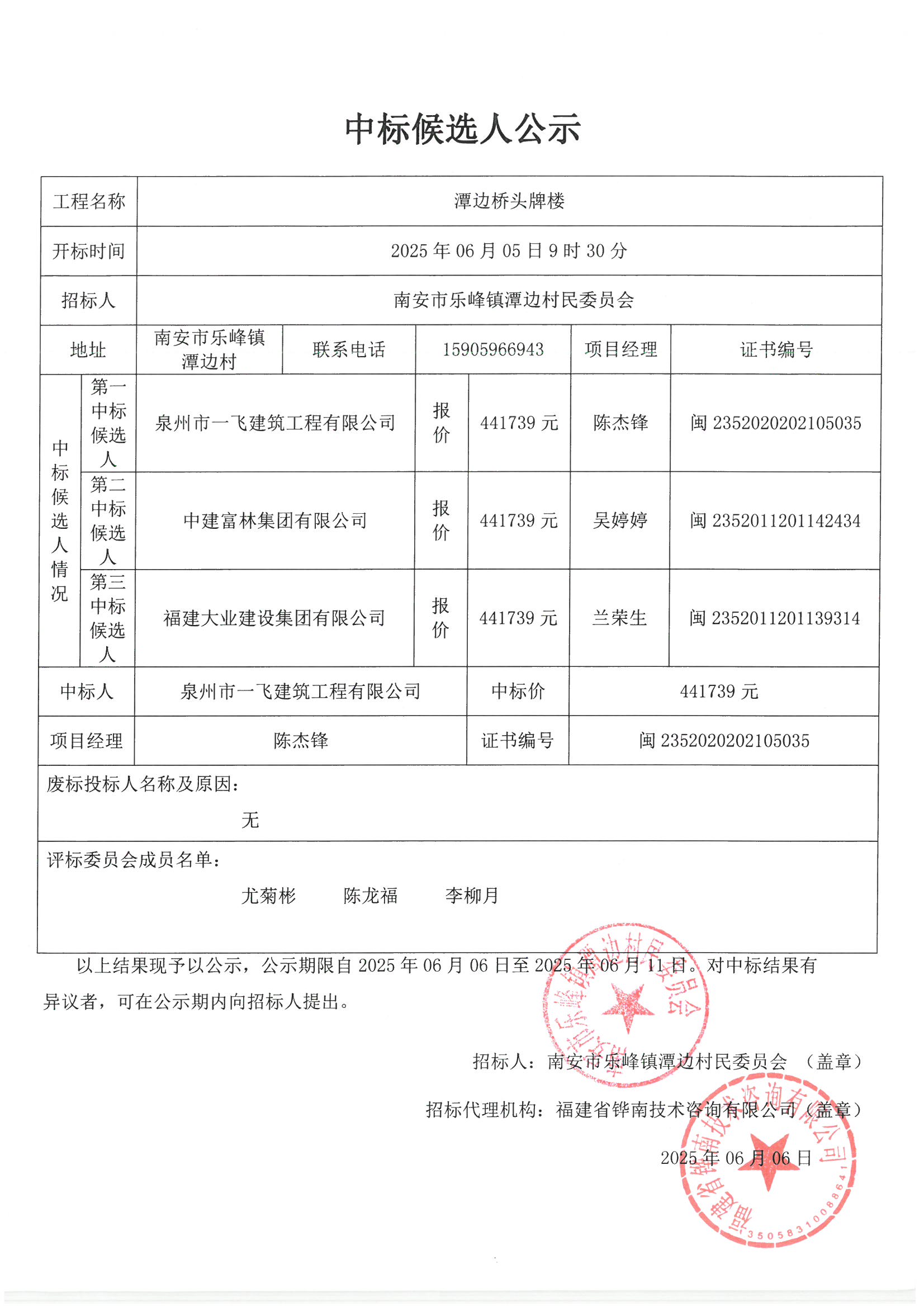 91九色 乐峰镇潭边桥头牌楼的中标候选人公示