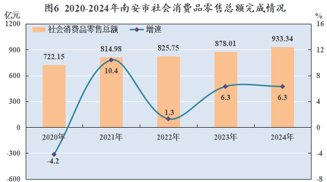 全年社会消费品零售总额933.34亿元,比上年增长6.3%。其中,限额以上社会消费品零售额154.83亿元,增长15.6%。从经营单位所在地看,城镇限上零售额134.99亿元,增长14.0%;乡村限上零售额19.84亿元,增长27.5%。其中:服装鞋帽针纺织品类增长23.3%,建筑及装潢材料类增长27.5%,粮油食品类增长25.8%,五金电料类增长29.2%,日用品类增长47.8%,通讯器材类增长30.4%,烟酒类增长24.0%,体育娱乐用品类增长66.3%,化妆品类增长90.6%,机电产品及设备类增长53.2%。