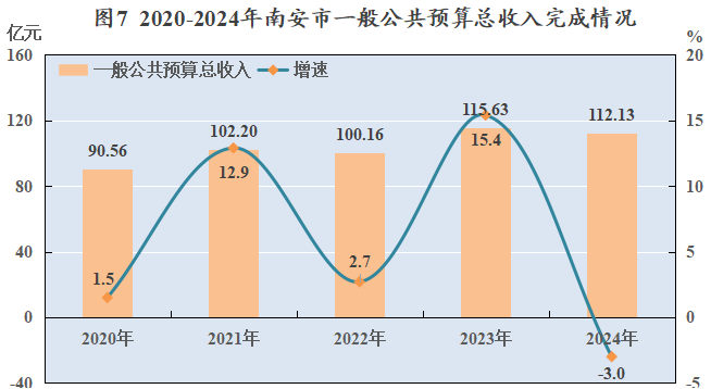 全年一般公共预算总收入112.13亿元,比上年下降3.0%。其中,一般公共预算收入78.24亿元,增长5.3%;中央财政收入33.89亿元,下降18.0%。一般公共预算支出100.29亿元,下降5.5%,其中:一般公共服务支出5.85亿元,下降0.7%;教育支出32.77亿元,增长3.6%;科学技术支出1.84亿元,增长10.9%;社会保障和就业支出19.38亿元,增长8.0%;卫生健康支出10.58亿元,增长8.1%。税收收入76.07亿元,下降17.0%。